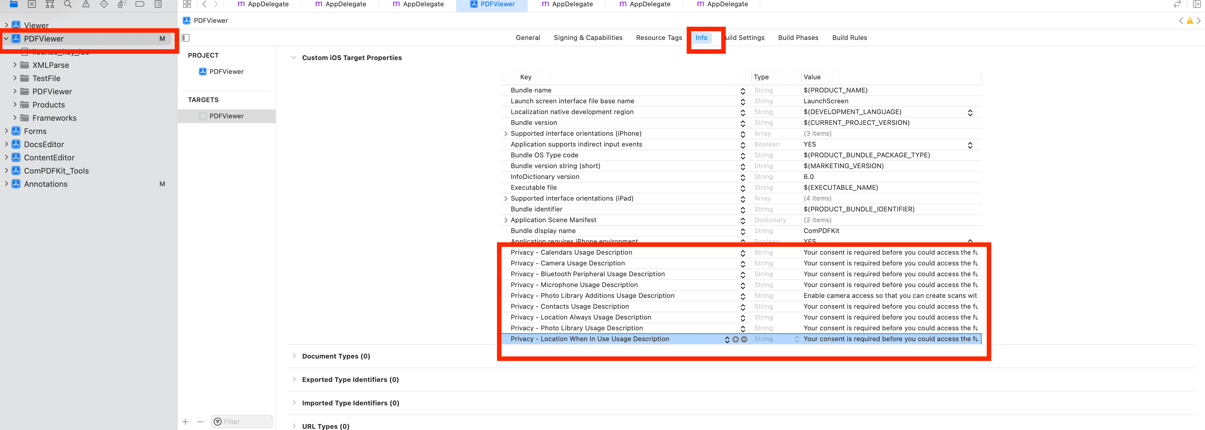 - To protect user privacy, before accessing the sensitive privacy data, you need to find the "*Info*" configuration in your iOS 10.0 or higher iOS project and configure the relevant privacy terms as shown in the following picture.