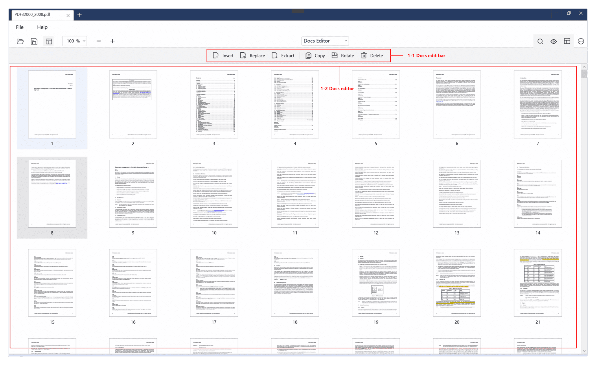 | Docs Editor | PDFPageEditBar | Include the toolbar for creating, replacing, rotating, extracting, and deleting PDF pages |