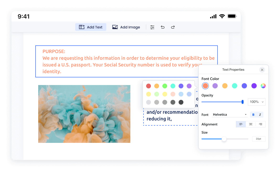 Empower the ability to add, move, and delete images in PDF documents, enabling precise adjustment of image properties such as size, position, rotation, and opacity.